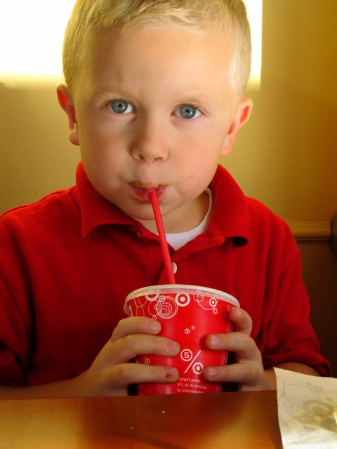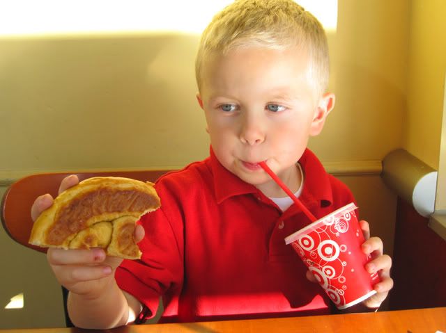 I had to run to target after school last week to pick up a prescription so of course Cole got dragged along. He was pretty tired and hungry and the ONLY way he was going to survive the 10 minute venture was if he was fed. We splurged on a pretzel, chocolate rice crispy treat and diet lemonade (he'll never know the difference). When I broke the pretzel in half he informed me that since he was the kid "he always got the bigger half". Great--he's already becoming the portion police. I love just having my camera in my purse at all times. It makes it fun to take pictures like these...